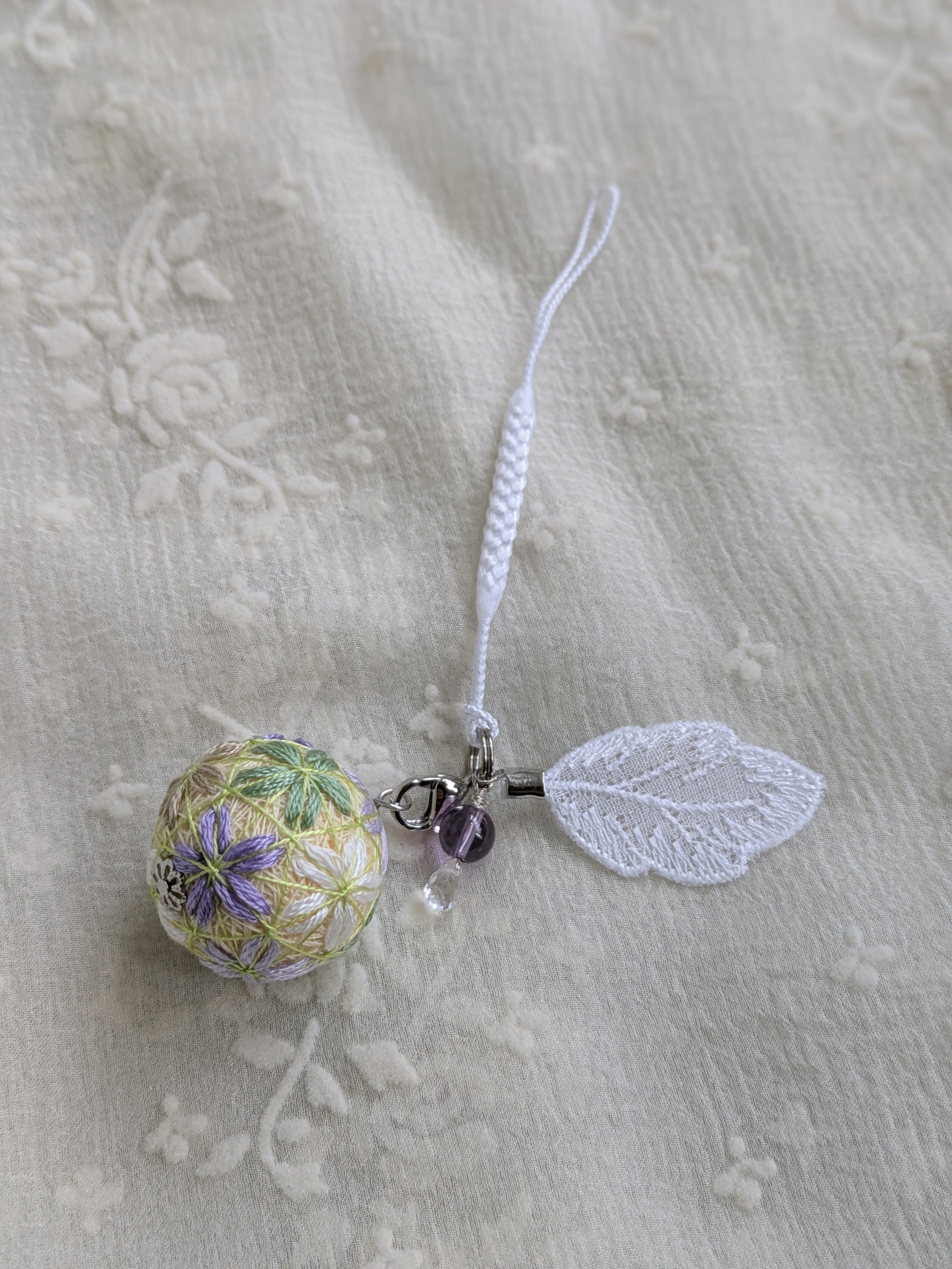 薄黄色の糸玉にフランス刺繍糸でパープル、グリーン、白などのお花を刺繍しています。
