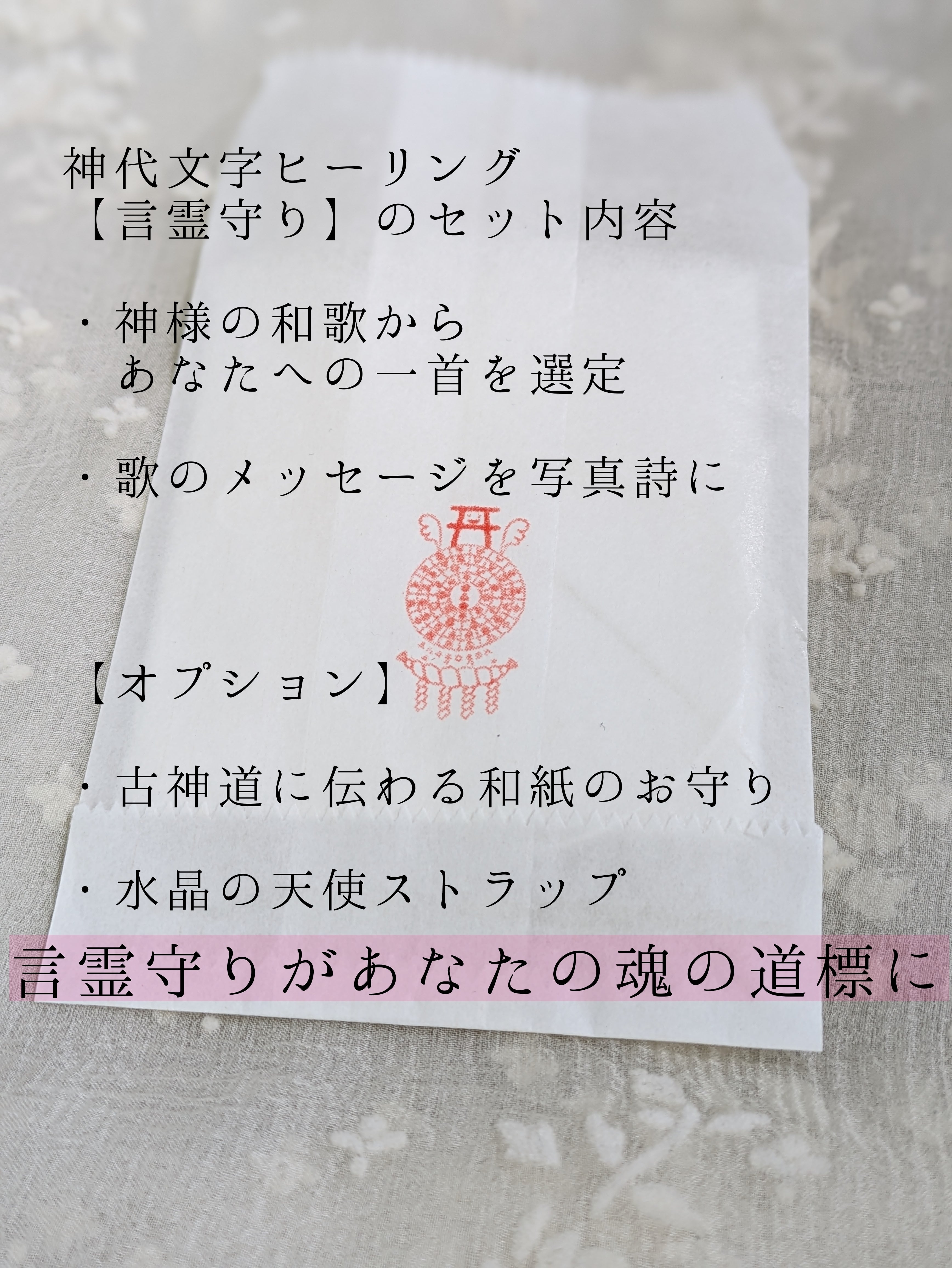 神様の言霊フトマニ歌で魂を整える「言霊守り」 〜神代文字ヒーリング〜 フトマニ歌 × 写真詩 ×神折符× 水晶の天使ストラップ