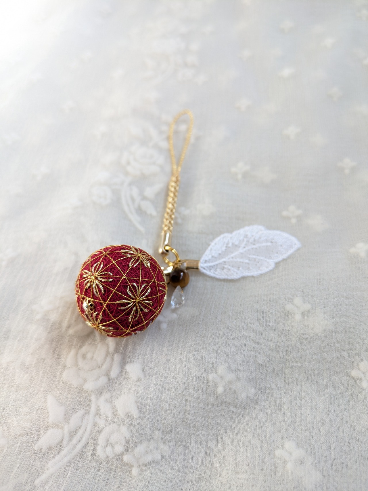 ※加賀手鞠は古来嫁ぐ娘の魔よけとして持たせていたそうです。日本各地でも手鞠は昔から玩具遊具として存在していました。綿を糸でひたすらクルクル糸巻きすると、まあるい糸玉が出来上がります。その表面にフランス刺繍糸で時間をかけて刺繍をしています。