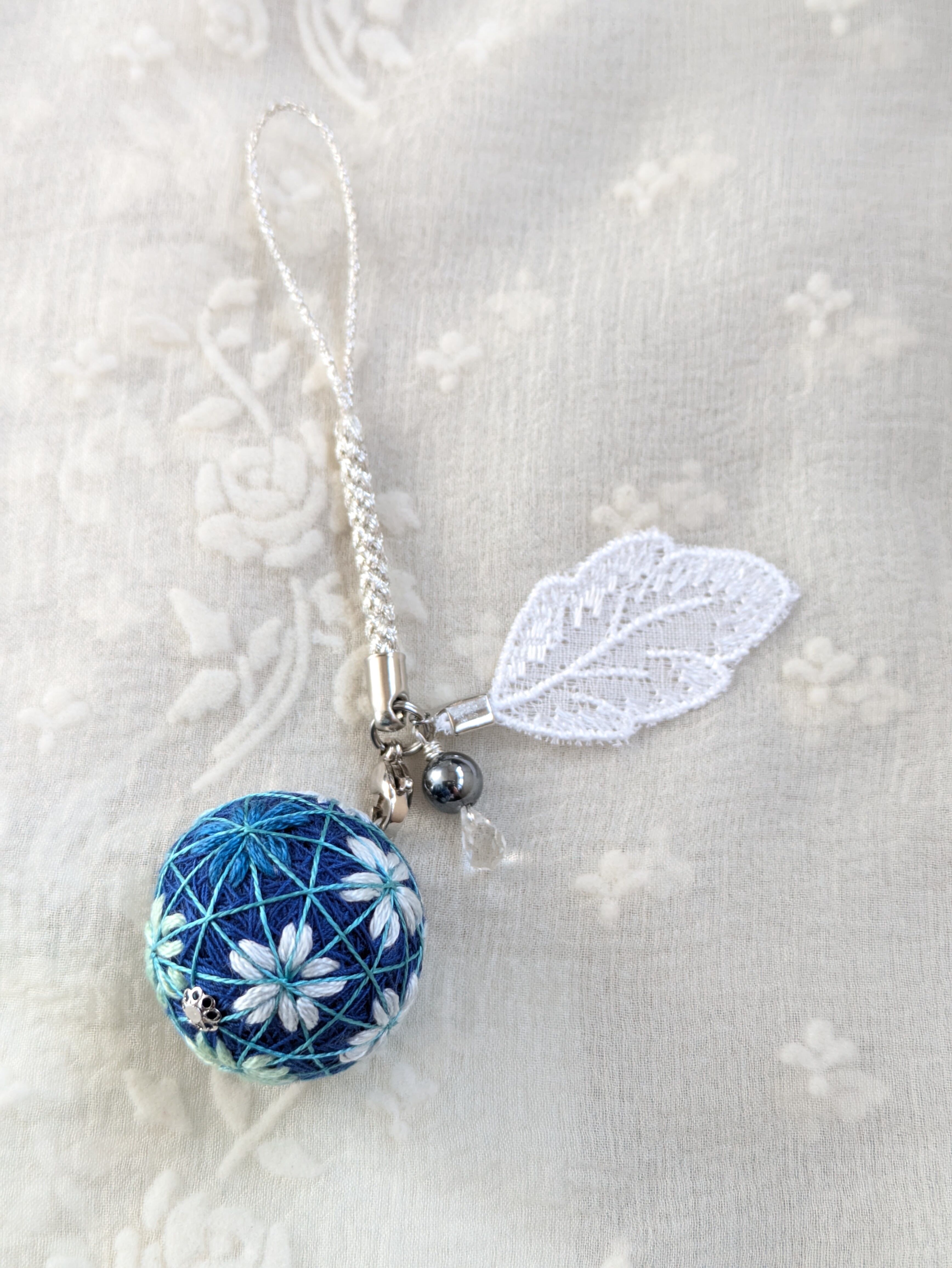 ※加賀手鞠は古来嫁ぐ娘の魔よけとして持たせていたそうです。日本各地でも手鞠は昔から玩具遊具として存在していました。綿を糸でひたすらクルクル糸巻きすると、まあるい糸玉が出来上がります。その表面にフランス刺繍糸で時間をかけて刺繍をしています。