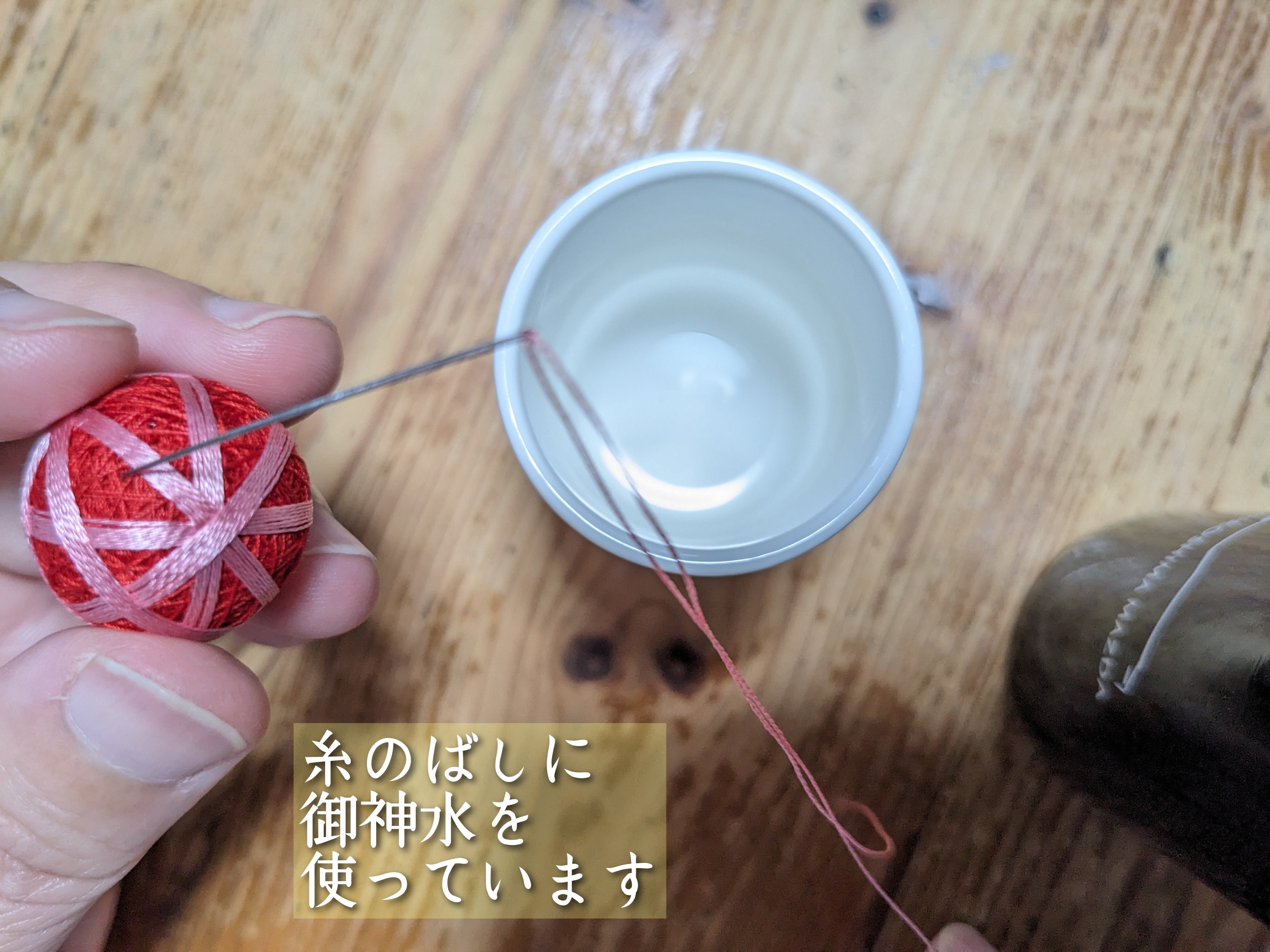 ②ご神水で、糸、針を清めてから制作に。