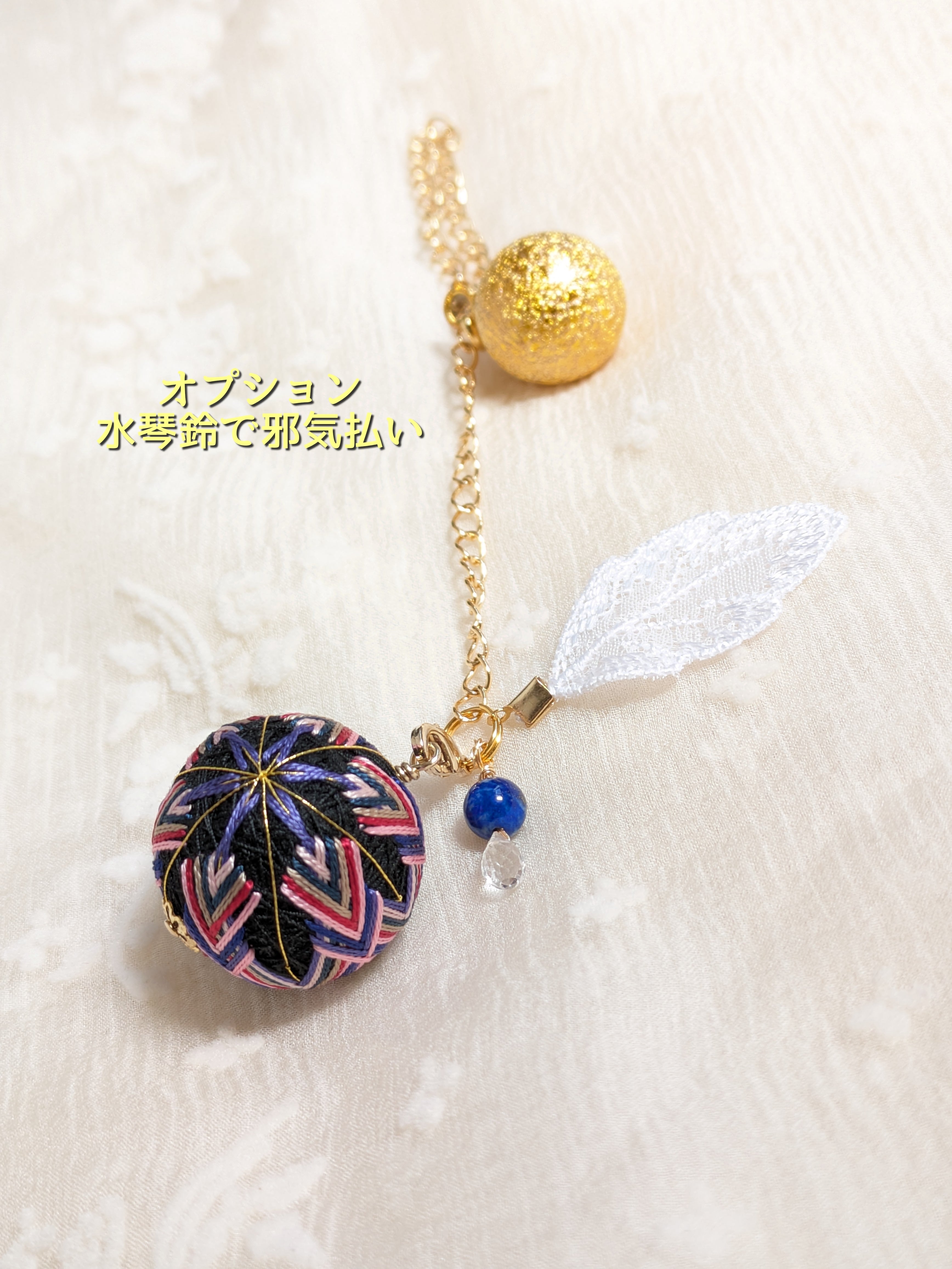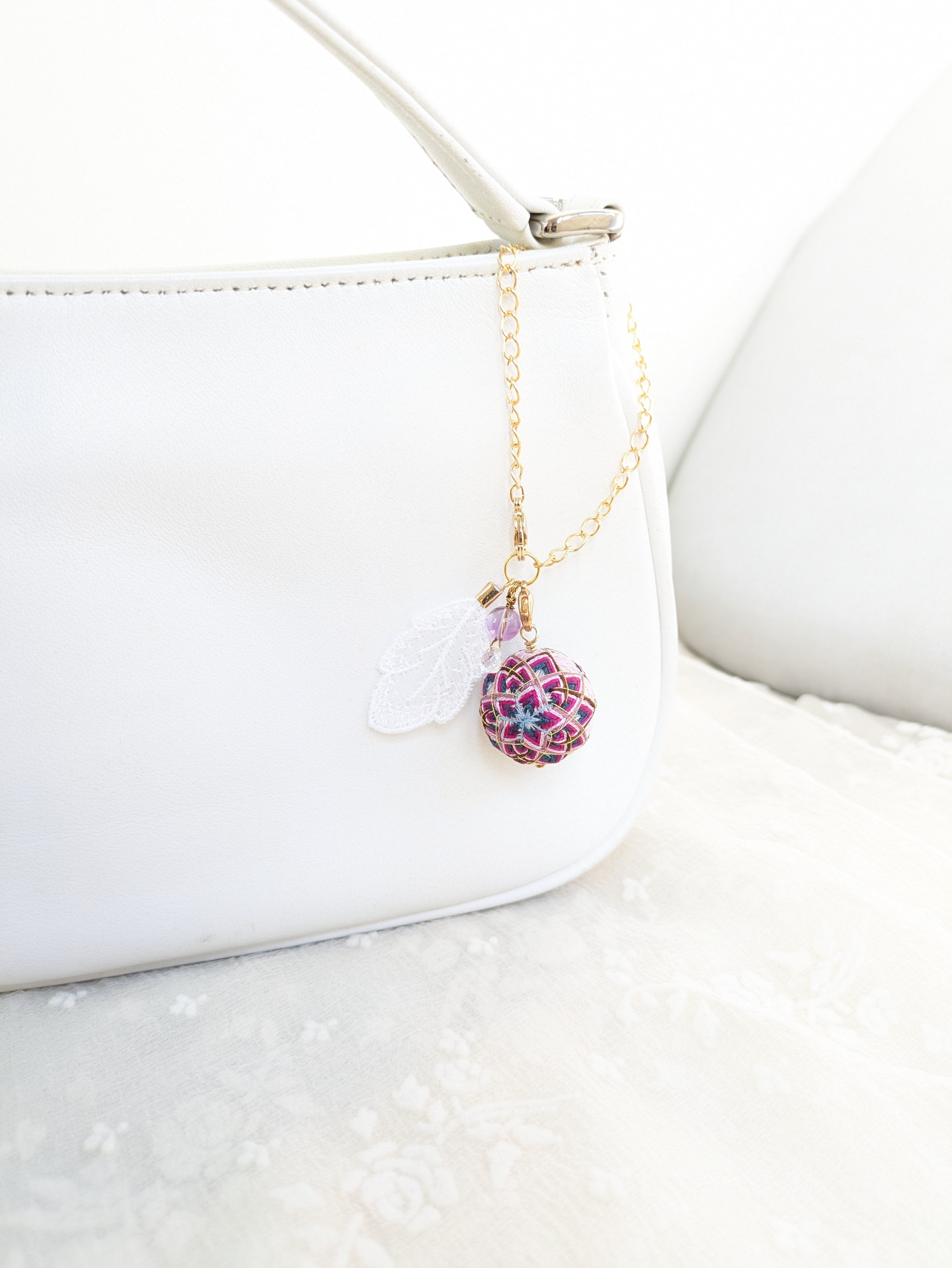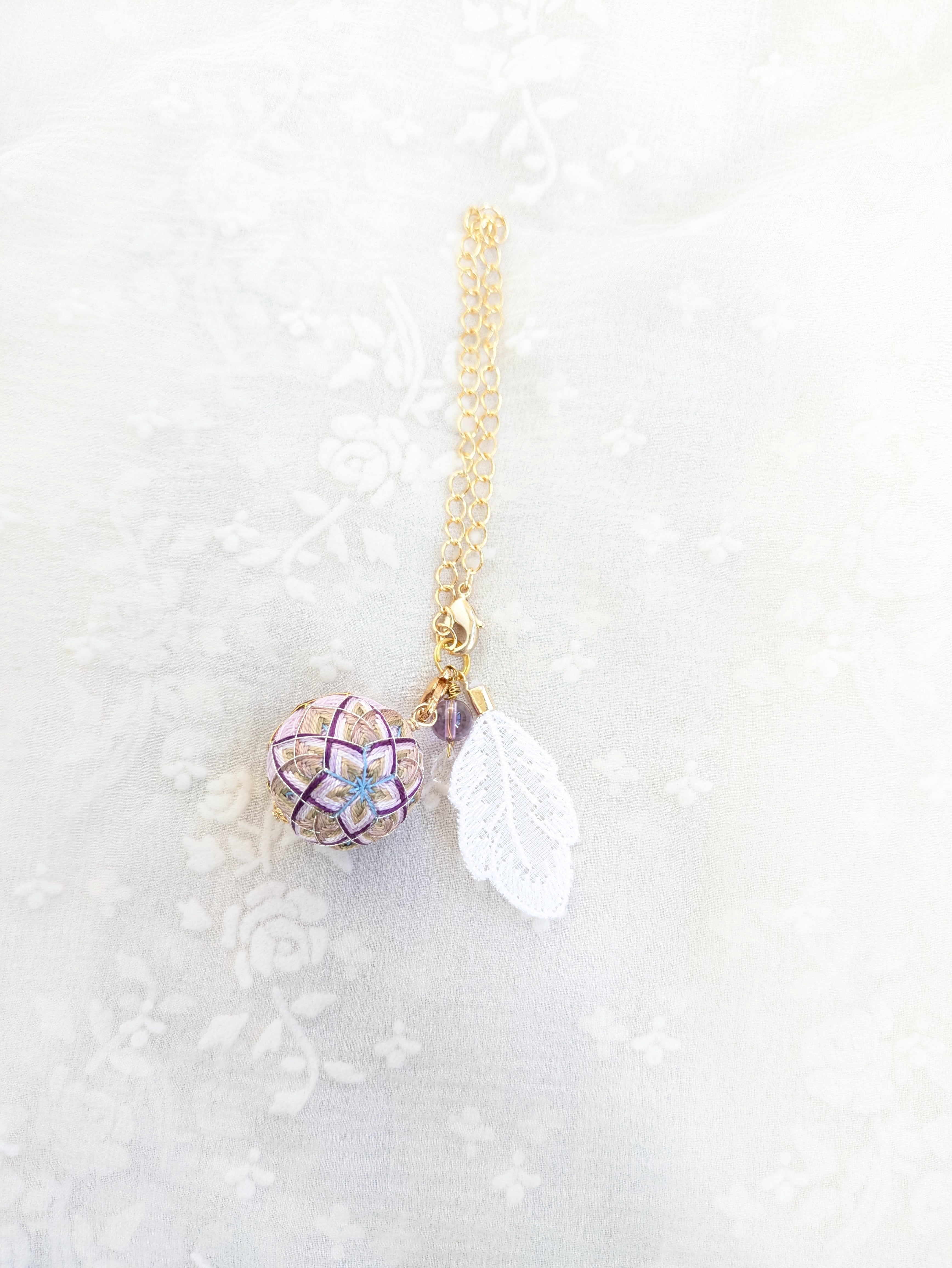 ②花手鞠はカニカンから取り外し可能。お手持ちの紐に通せばペンダントとしてお楽しみいただけます。