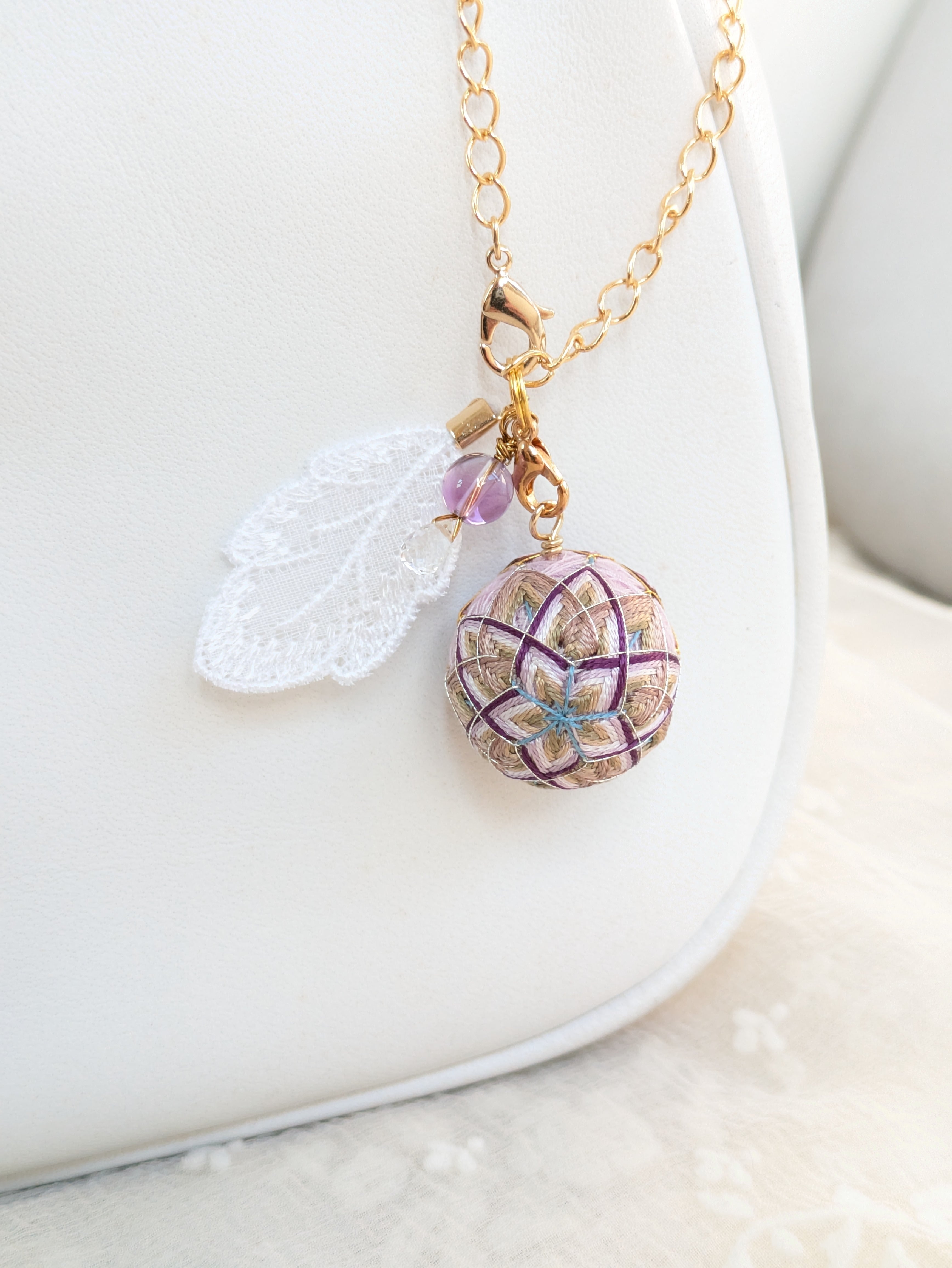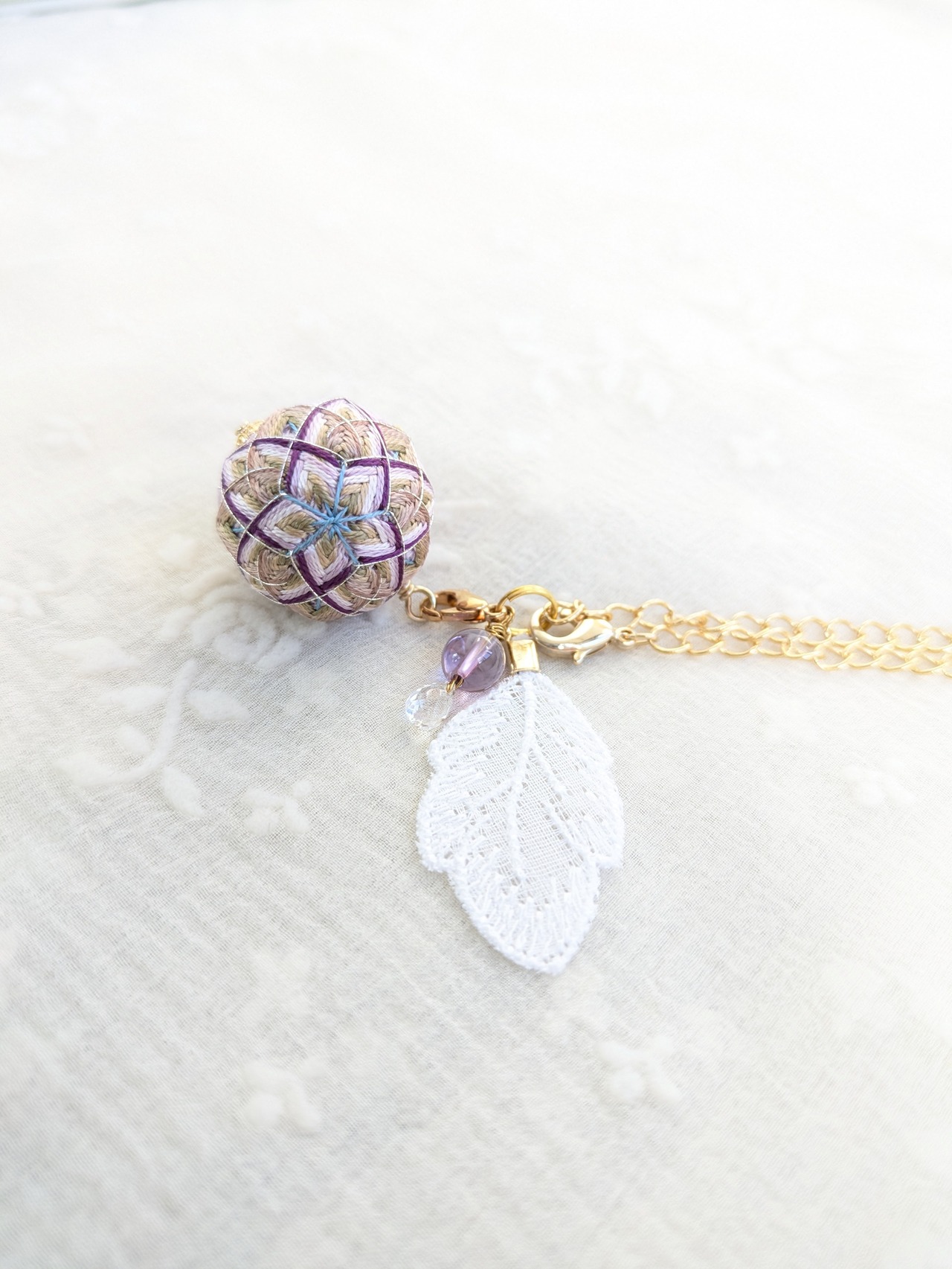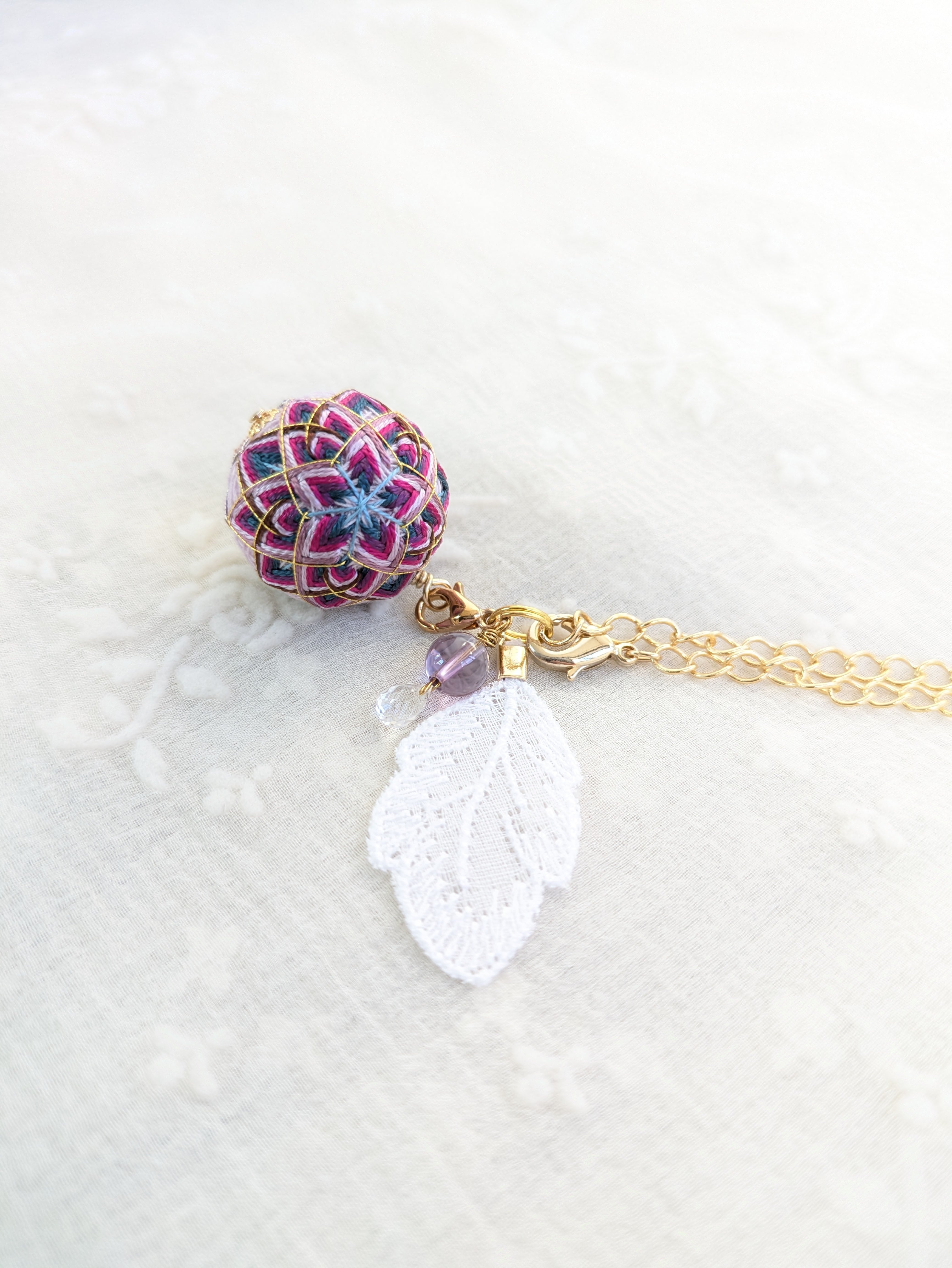②花手鞠はカニカンから取り外し可能。お手持ちの紐に通せばペンダントとしてお楽しみいただけます。