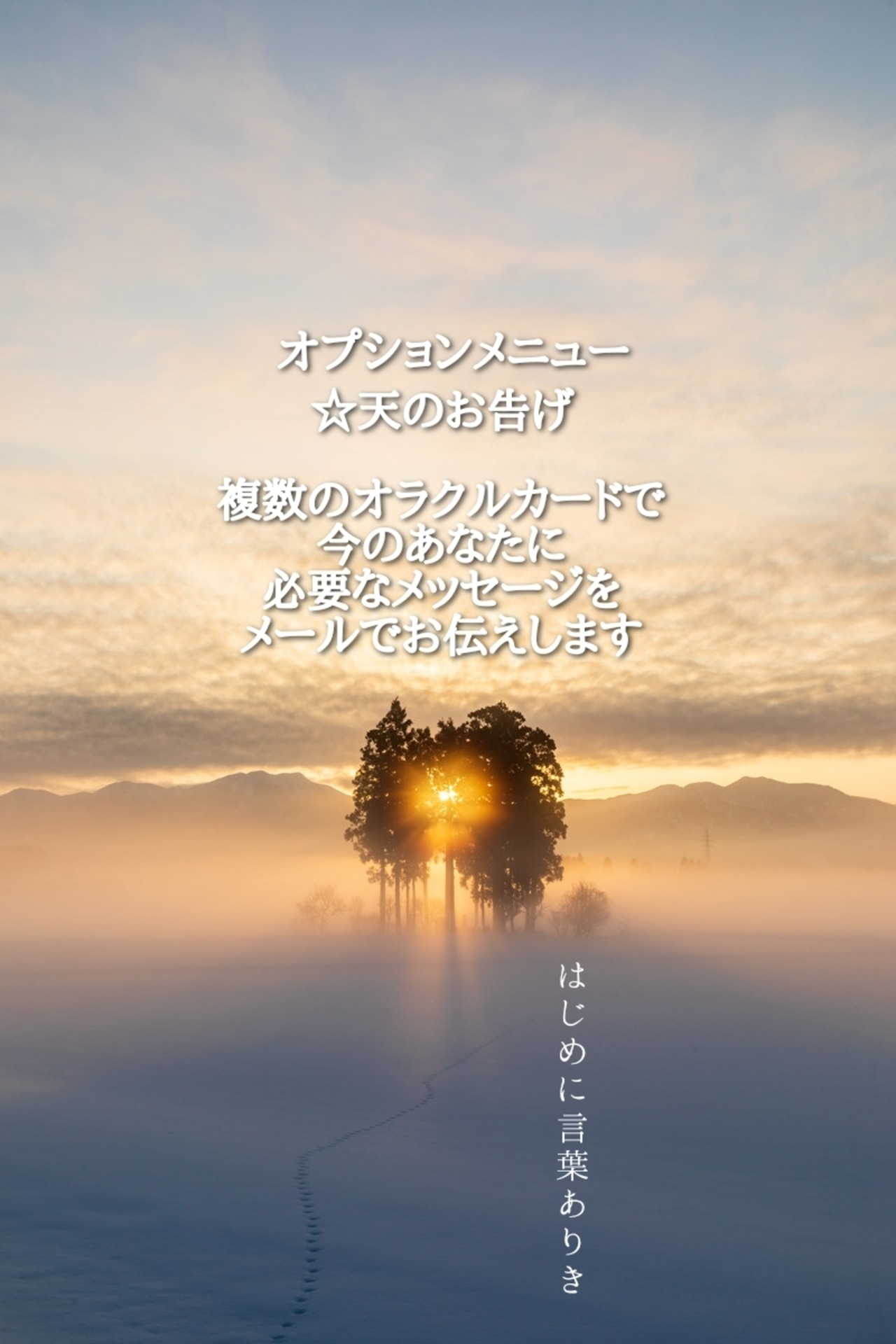 ⑥【天のお告げ】願い事に対してのアドバイスを。複数のカード(スペシャルカードも!)から、あなたへのアドバイスメッセージをお伝えします。願いを叶える秘訣は覚悟を保つこと。心の持ち方が定まります。