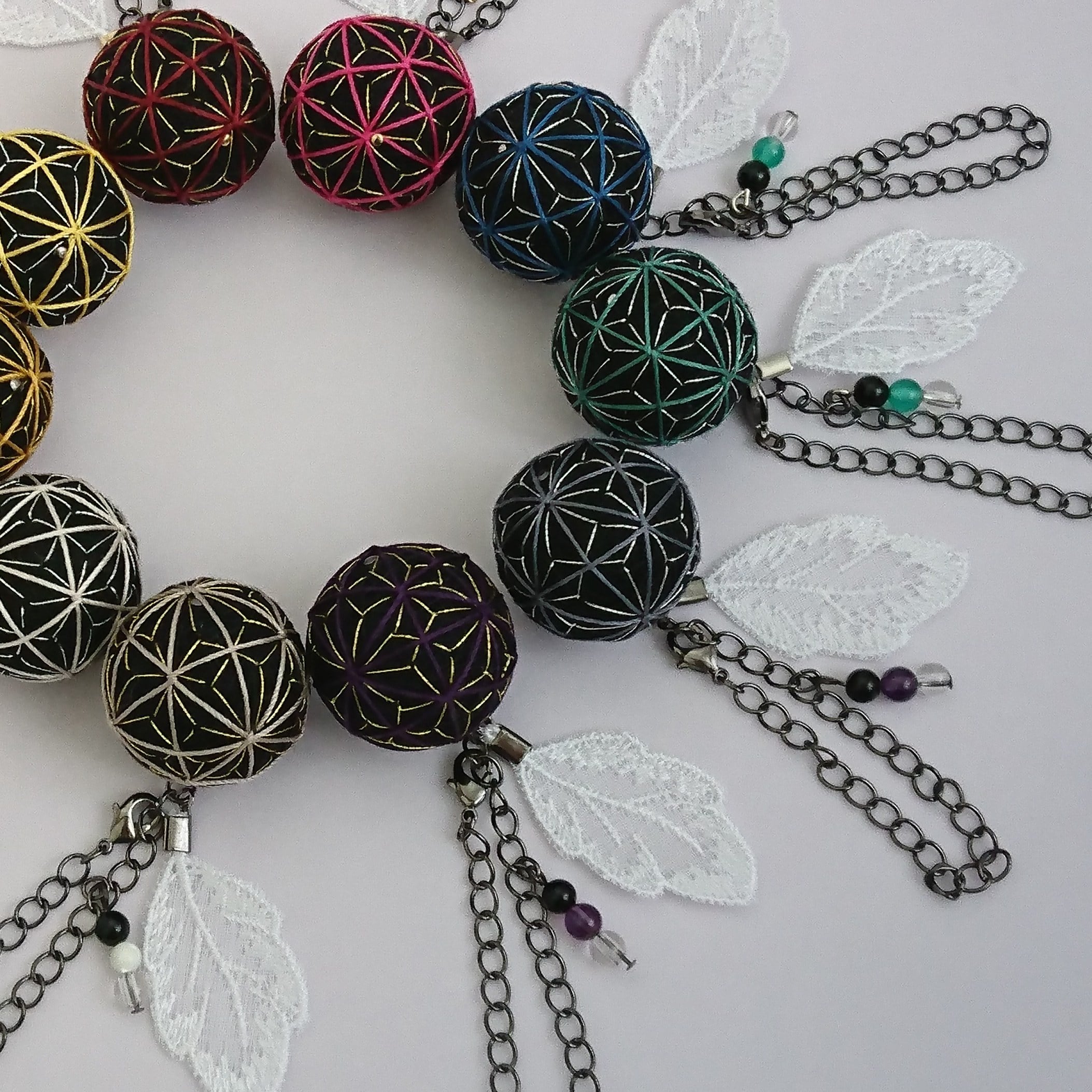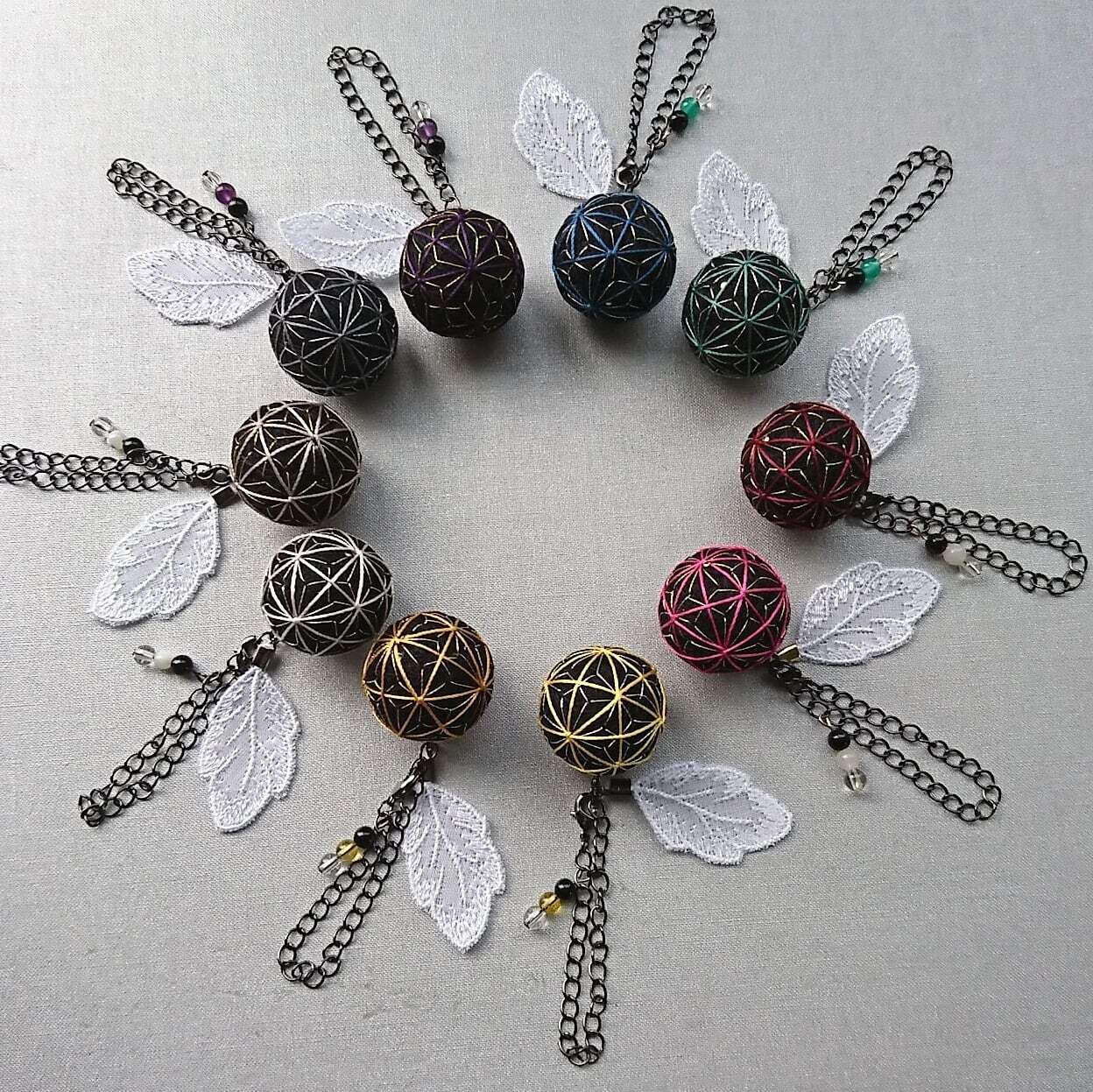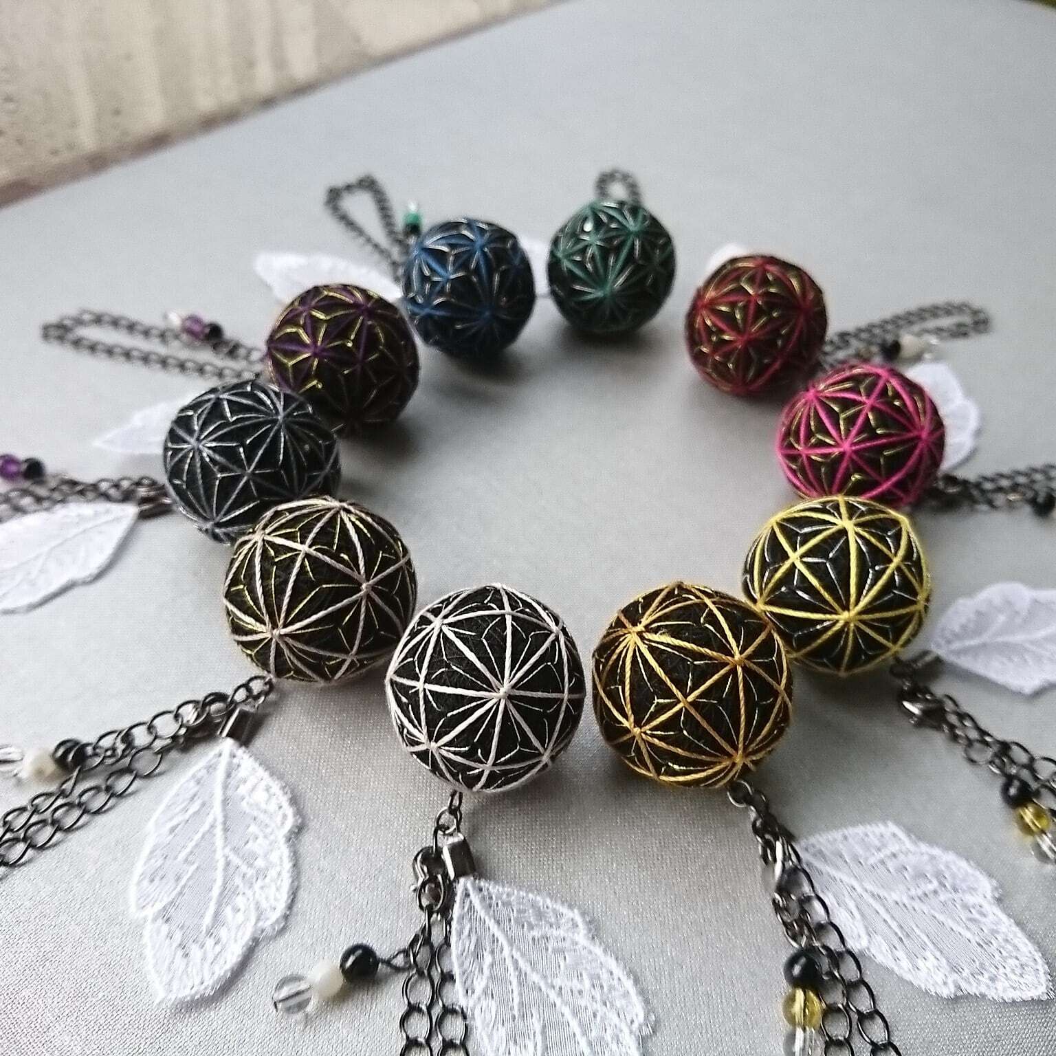 ※加賀手鞠は古来嫁ぐ娘の魔よけとして持たせていました。日本各地でも手鞠は昔から玩具遊具として存在していました。綿を糸でひたすらクルクル糸巻きすると、まあるい糸玉が出来上がります。その表面に絹糸で時間をかけて刺繍をしています。