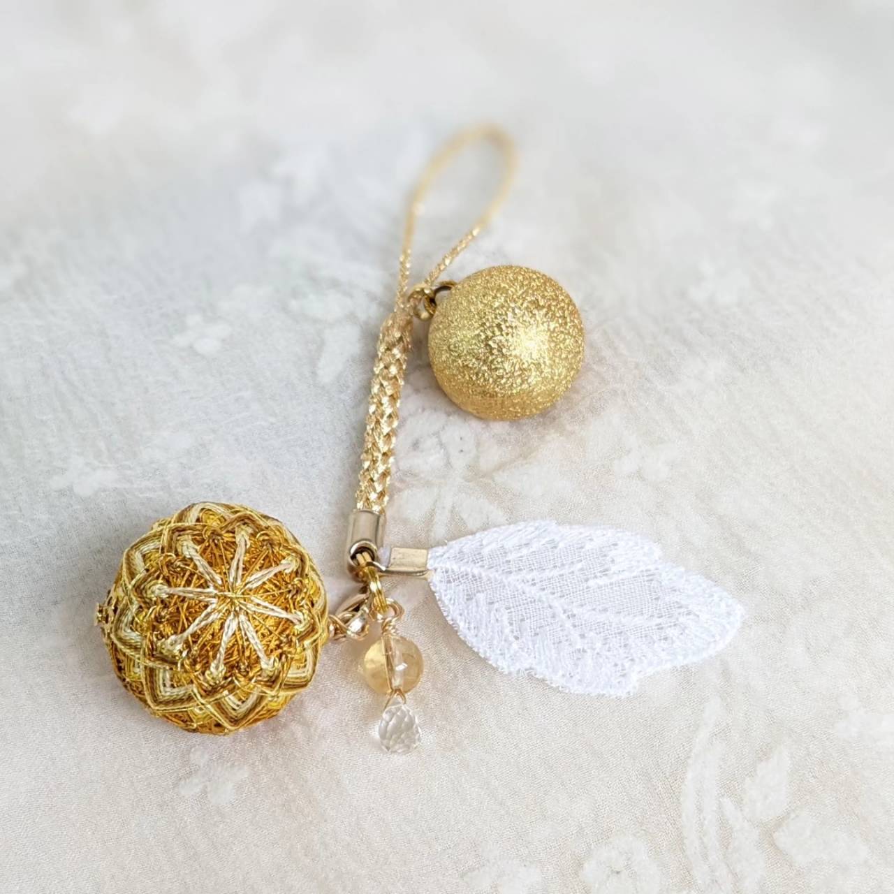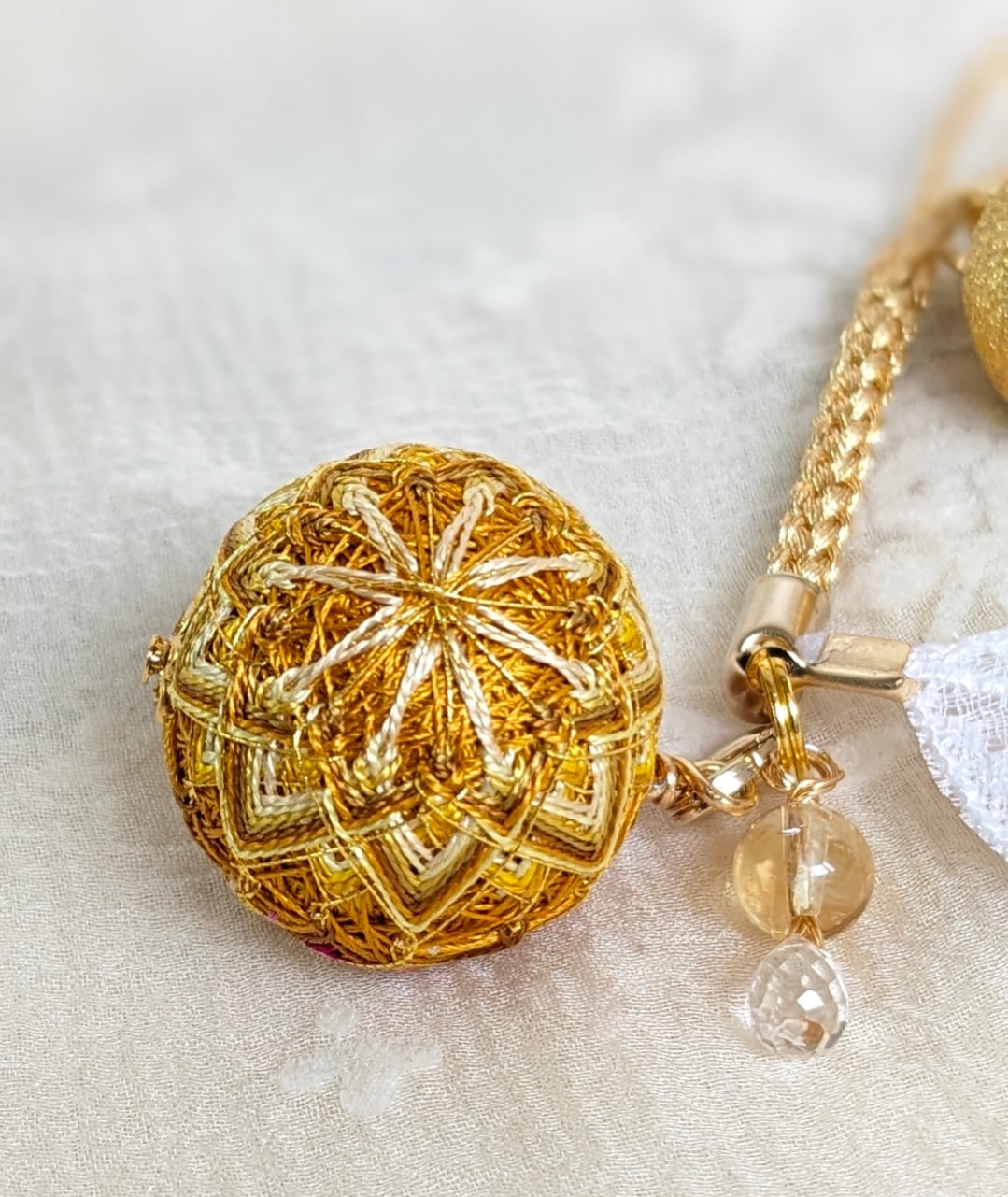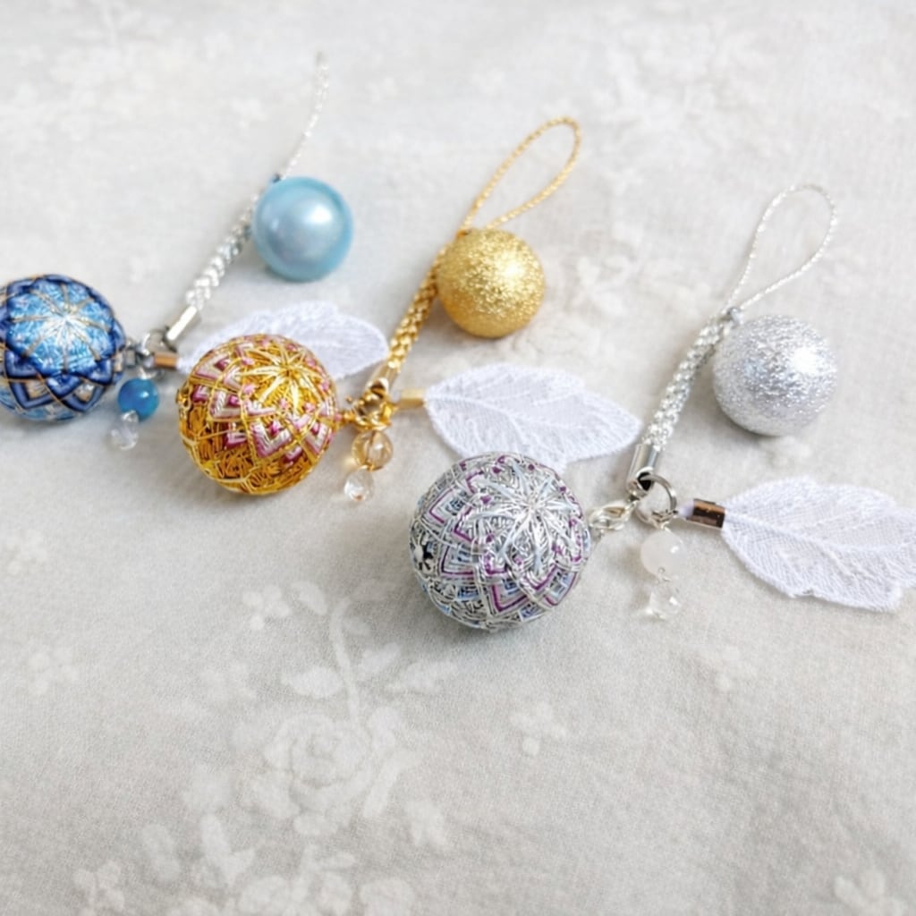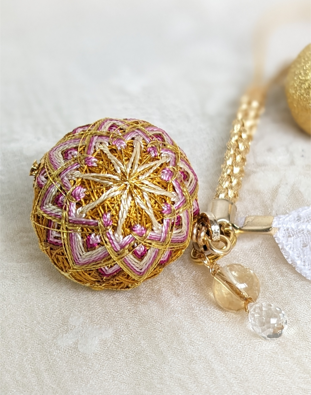 ※加賀手鞠は古来嫁ぐ娘の魔よけとして持たせていたそうです。綿を糸でひたすらクルクル糸巻きすると、まあるい糸玉が出来上がります。その表面に絹糸で時間をかけて刺繍をしています。